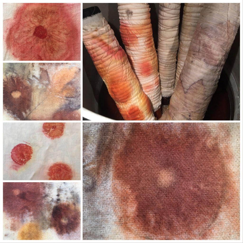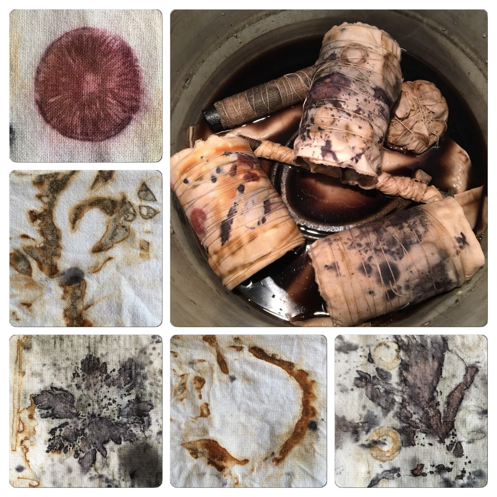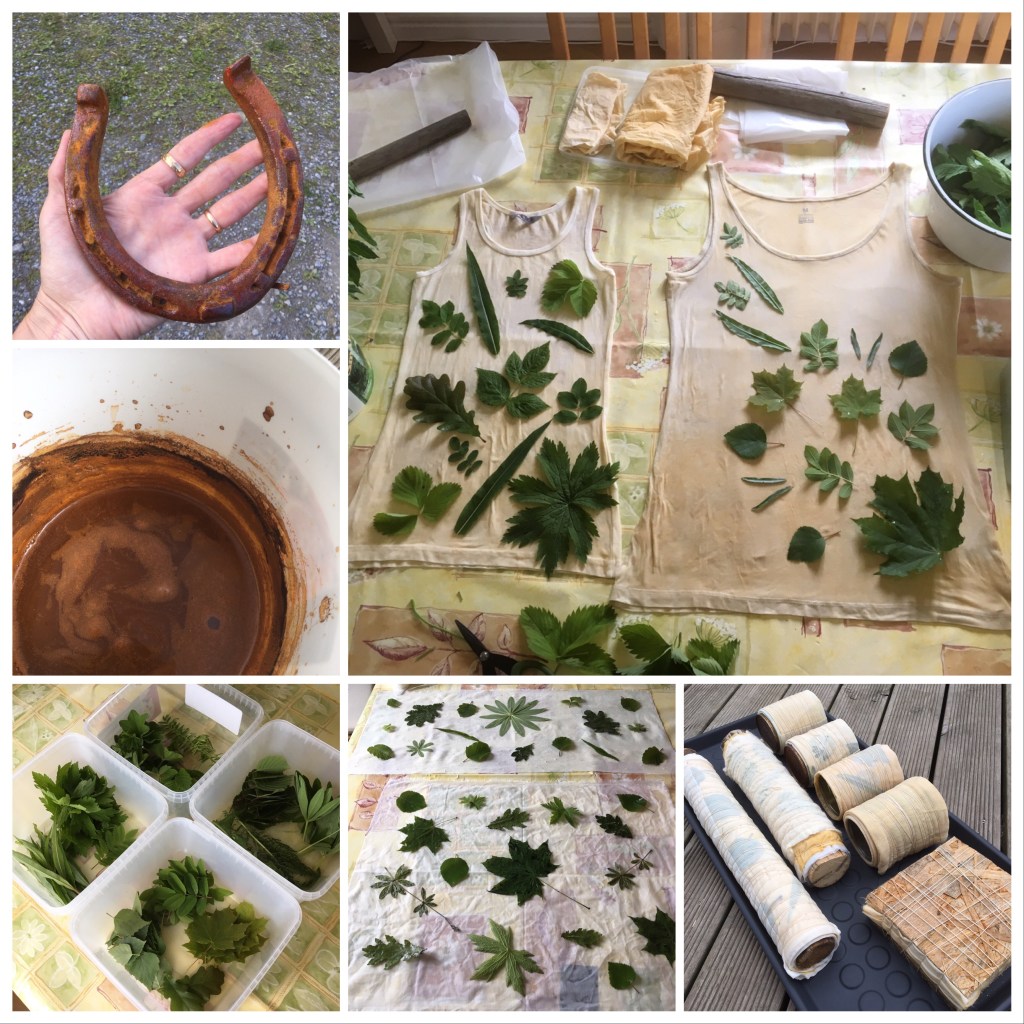 Förra sommaren experimenterade jag lite med en teknik som kallas eco printing, som kan beskrivas som en kombination av växtfärgning, tryck och batik. Tekniken utvecklades ursprungligen i Australien av India Flint, som började sina experiment med eukalyptus. Därifrån har det spridits över världen, där många har vidareutvecklat egna metoder och breddat kunskapen om vilka växter som går att använda. I sin enklaste form används järnskrot som får ligga och rosta i vatten. Tyger och/eller blad doppas i rostvattnet, rullas ihop hårt och kan sedan ångas eller kokas, det sistnämnda gärna i ett växtfärgsbad. Järn (och andra metaller) har länge använts för att beta garn och tyger inom växtfärgning, men reagerar även med tanniner och andra kemiska substanser i växter vilket ger avtryck från bladen på tyget.