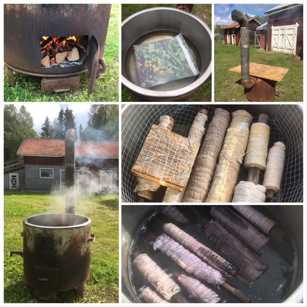 Last summer, I did some experimenting with a technique called eco printing, which can be described as a combination of plant dyeing, printing and tie-dying. The technique was originally developed in Australia by India Flint, who began her experiments with eucalyptus. From there it has spread over the world, where many have developed their own methods and broadened the knowledge on which plants that can be used. In its simplest form, scraps of metal containing iron are used to make rusty iron water. Fabrics and/or leaves are dipped in the rusty water, rolled into tight bundles, and can then be steamed or boiled, where the latter can be done in a plant dye bath. Iron (and other metals) has long been used to mordant yarn and fabrics in natural dyeing, but iron also reacts with tannins and other chemical substances in plants, leaving prints of the leaves on the fabric.