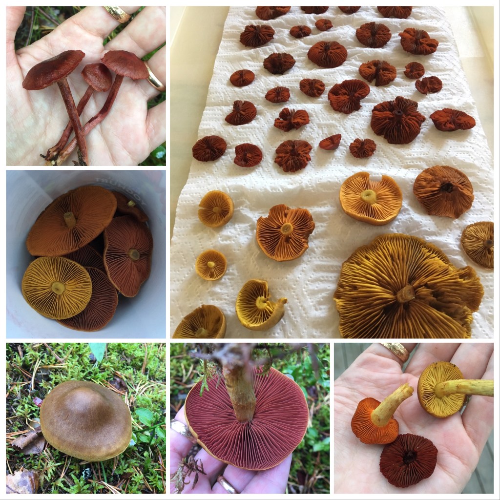 En del svampar används också till färgning, av framför allt garn, och jag råkar ha gjort mitt examensarbete inom biologi på just svampsläktet Cortinarius (spindelskivlingar) som innehåller flera arter som är erkänt bra färgsvampar. Bland spindelskivlingarna finns även några av våra mest giftigaste svampar, så här bör man ha en viss kunskap och försiktighetstänk! Men jag kunde inte låta bli att även testa eco printing med några av dessa skönheter när de dök upp i höstas.