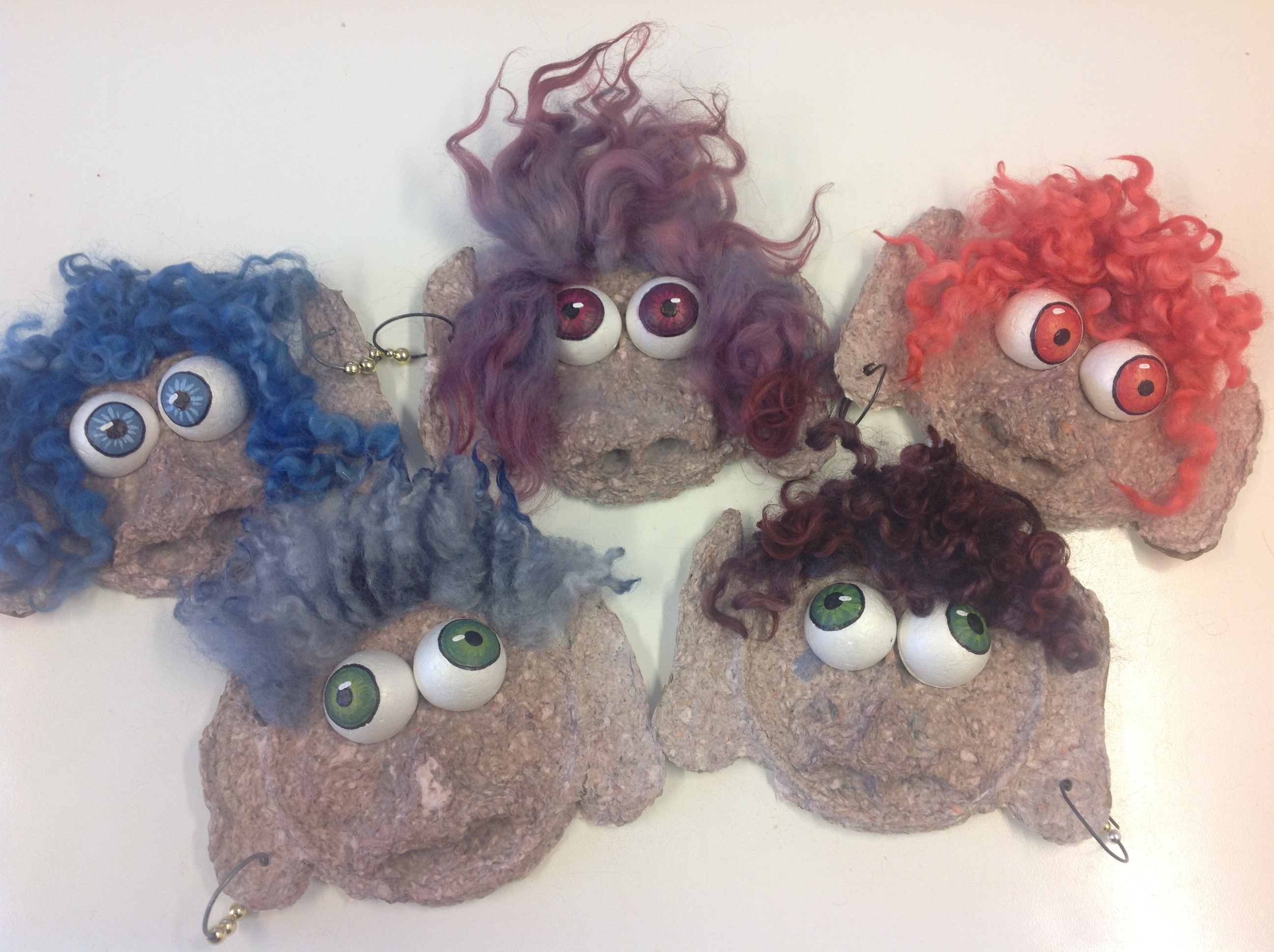 Sen målade vi ögon på halverade frigolitkulor, gjorde örhängen av metalltråd och pärlor och letade rätt på lite egenhändigt färgad fårull till hår. Allt detta klistrades fast med limpistol.