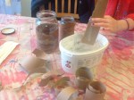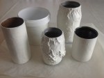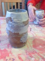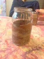 Burkarna täcktes först med ett lager av pappersremsor. Man doppar dem i limlösningen, drar av överflödet och kletar fast. Några extra remsor här och var för strukturens skull. På några av burkarna kletade vi även dit pappersmassa i klumpar. Överdriv gärna! Det sjunker ihop när det torkar. Dotterns kletande gav bättre resultat än mitt mer försiktiga. Sen ska det torka. Det tar tid. Vi ställde våra i ugnen på låg värme (50 grader och ugnsluckan på glänt).