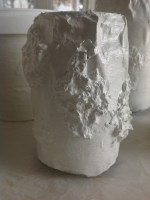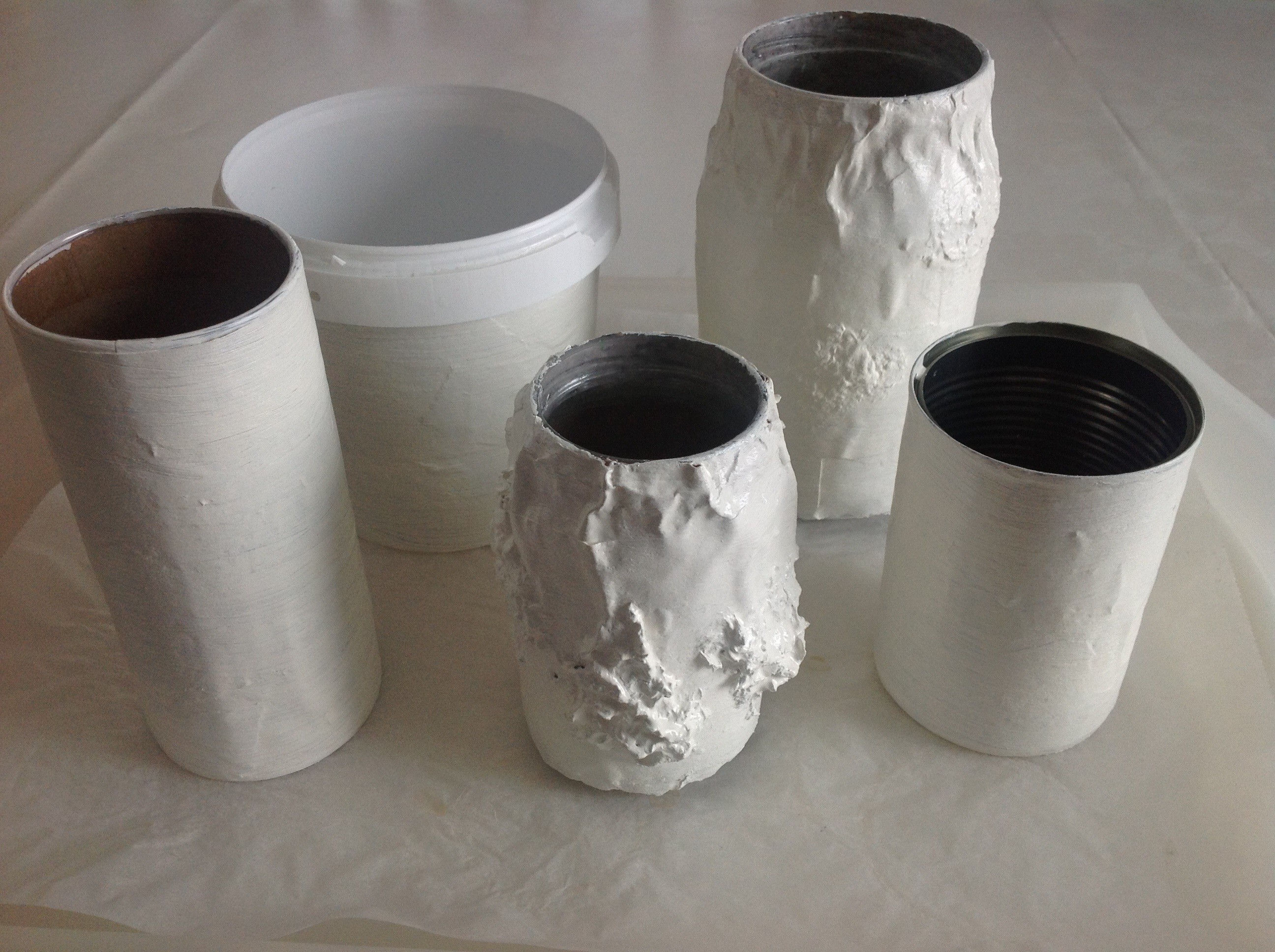 Burkarna täcktes först med ett lager av pappersremsor. Man doppar dem i limlösningen, drar av överflödet och kletar fast. Några extra remsor här och var för strukturens skull. På några av burkarna kletade vi även dit pappersmassa i klumpar. Överdriv gärna! Det sjunker ihop när det torkar. Dotterns kletande gav bättre resultat än mitt mer försiktiga. Sen ska det torka. Det tar tid. Vi ställde våra i ugnen på låg värme (50 grader och ugnsluckan på glänt).