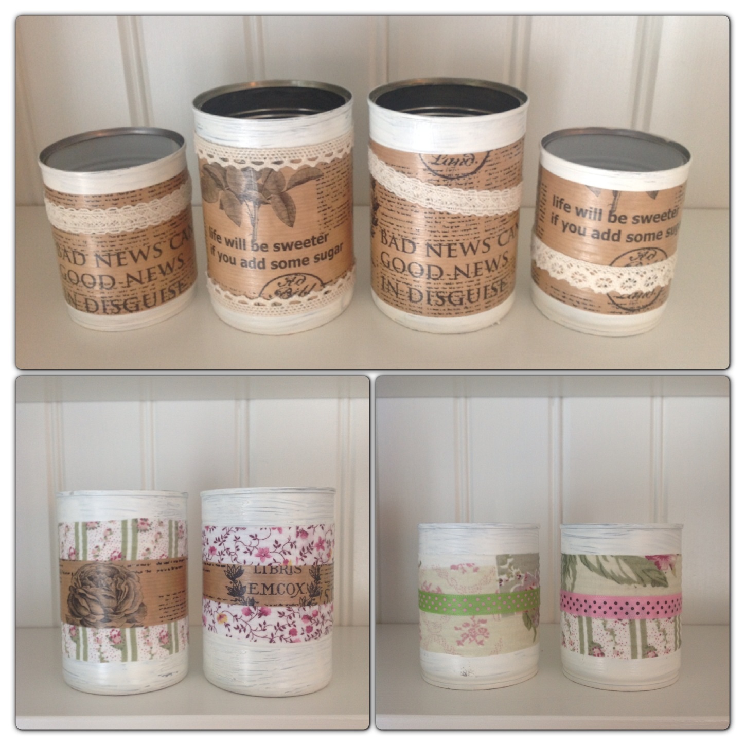 Efter att ha sett alla fina bidrag i konservburksutmaningen på bloggen Huset Nummer 10, och däribland de fina burkarna på bloggen Handkraft & Återbruk, var vi tvugna att göra några egna. Jag målade burkarna (lite lagom slarvigt) med vit färg. Sen fick döttrarna vara med och klistra på omslagspapper, tyg och band. När vi hade klistrat färdigt fick burkarna också ett extra lager decoupagelim (som även fungerar som lack). Nu återstår bara att bestämma vad vi ska ha i dem. Blommande vårlökar eller pennor, penslar, saxar och andra pysselredskap. Åtta burkar räcker ju som tur är till båda delarna. 🙂