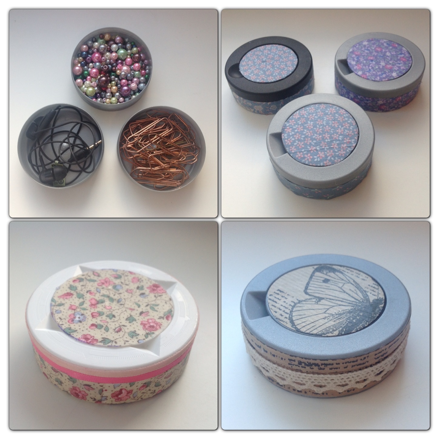 Snusdosor (som tömts och diskats ur) kan man ha till mycket. De är ypperliga att förvara småsaker i. Men man kan ju piffa upp dem lite också så att de ser lite roligare ut. Lite tyg eller papper, kanske några band, och lim. Jag använde decoupagelim som fungerar som både lim och lack. Men i brist på det kan man ta t.ex. trälim, som eventuellt späds med lite vatten för att bli lättare att pensla på, och sugas upp av, det man vill limma fast.