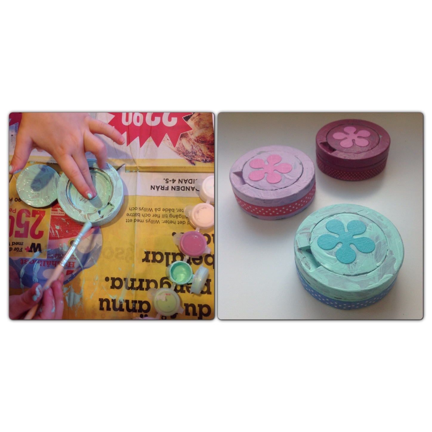Min yngsta dotter (3,5 år) valde att måla sina istället. Det är knepigt att måla på plast och färgen flagnar troligen rätt lätt, men vill man måla så måste man ju få prova det också. Sen blev det dekor med band och blommor utstansade i papper som vi limmade fast. Även dessa fick ett extra lager decoupagelim så får vi se hur länge färgen håller.