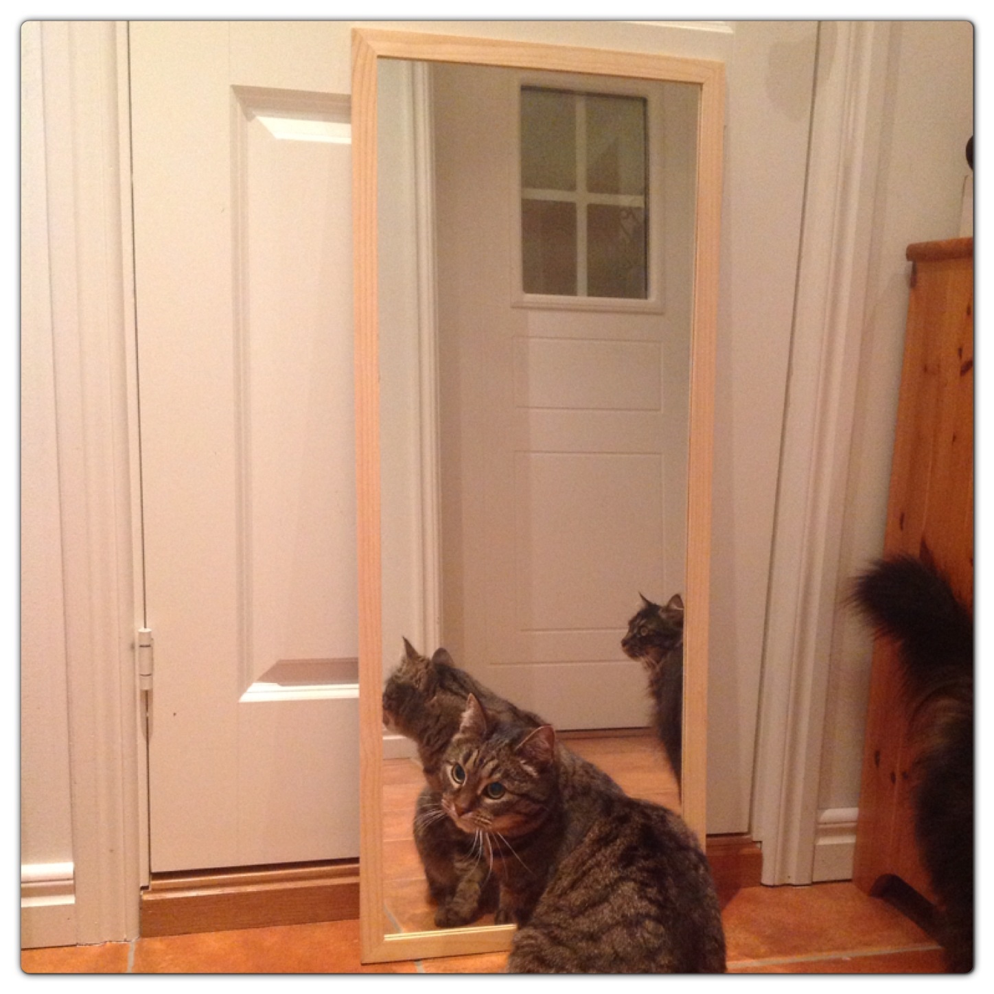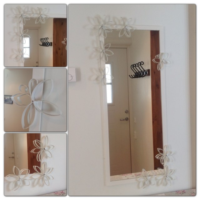 Jag råkade ha en spegel med obehandlad träram som behövde piffas upp (katterna som syns på bilden tyckte det var oerhört intressant när den kom fram). Jag målade ramen vit och limmade fast blommor och en fjäril med limpistol. Jag är riktigt nöjd med resultatet. Det ser inte alls ut som toarullar längre.
