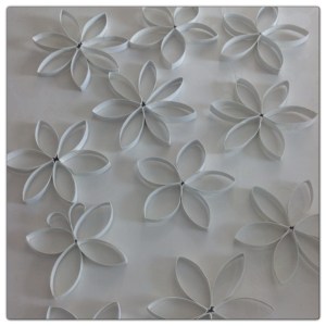 Man klämmer helt enkelt ihop (plattar till) rullarna och klipper av jämnbreda ringar. Jag mätte ut avstånd på 1 cm på rullarna innan jag klippte. Sedan kan man leka med formerna innan man bestämer sig för hur de ska sättas ihop. Jag fastnade för blommor av 5, 6 eller 7 ringar. Min äldsta dotter (8 år) kom på att man kunde göra tulpaner av tre ringar, och min yngsta (3,5 år) ville göra fjärilar. Vi använde ett snabbtorkande lim och klädnypor för att fästa ringarna i varandra och sedan målade jag dem vita.