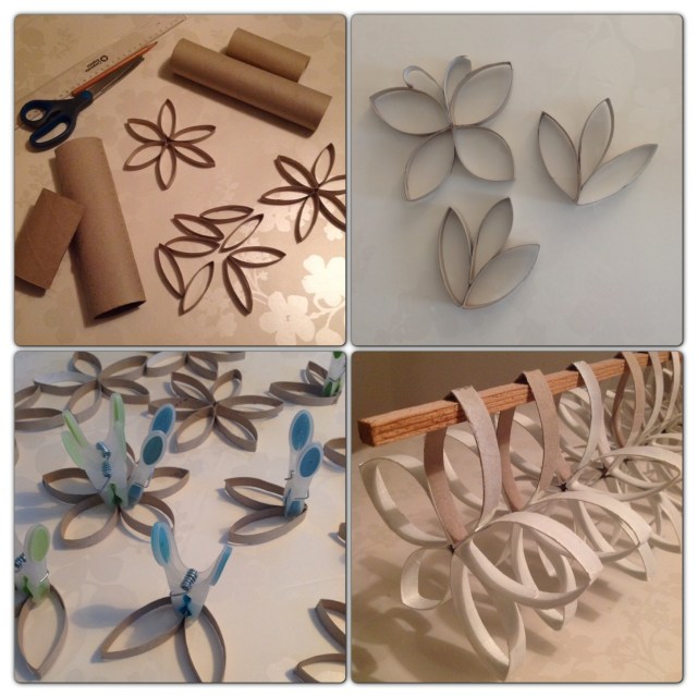 På bloggen Growing up creative hittade jag ett roligt sätt att använda tomma toa- och hushållspappersrullar till dekoration. Väldigt enkelt, kan varieras i det oändliga, och fint blir det också.