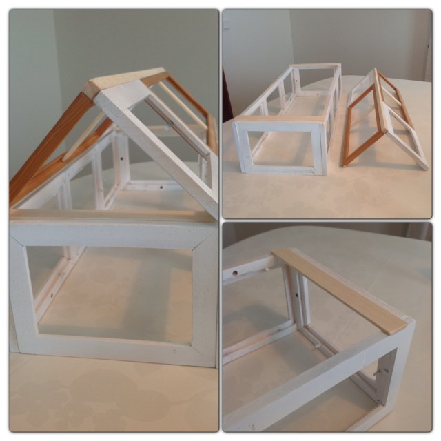 Jag satte tre ramar i bredd på vardera långsida, och en på vardera kortsida. Det visade sig vara en lämplig storlek för att kunna stå på ett plastfat till en liten balkonglåda. Taket motsvarar två längder med tre ramar i bredd satta i rät vinkel mot en fyrkantig stav. Nu hade jag inte riktigt så många ramar i samma storlek som jag behövde (jag hade 10 och hade behövt 14). Men av två större ramar, och några lösa glasskivor, lyckades jag knåpa ihop två delar som vardera motsvarade två ramar i bredd. Det där blev kanske bara förvirrande, men på bilderna syns de delarna tydligt eftersom de var omålade. Sen limmade jag också fast en lite bredare pinne vid kortsidorna (återigen – se bild) så att taket skulle ha lite mer yta att vila på.