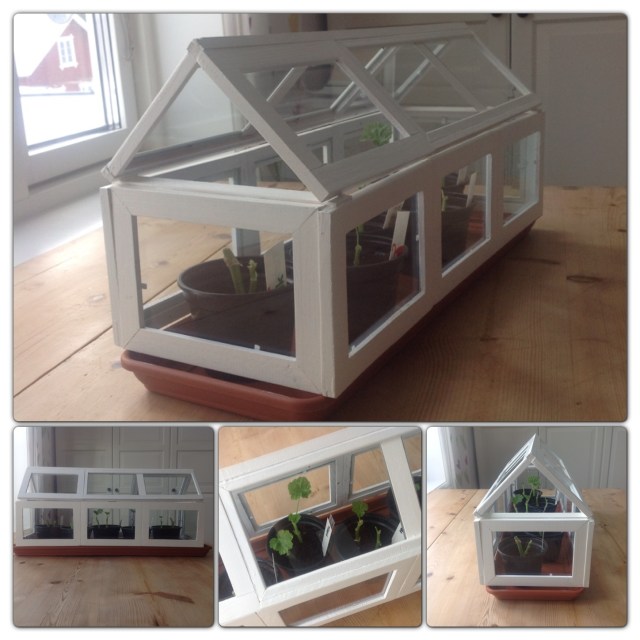 Ja, sen målade jag allt ett till varv och satte in glasen igen. Jag har inte gjort något med gavlarna på taket än. Kanske limmar dit en trekantig träbit, eller genomskinlig hårdplast, eller bara låter det vara. Lite ventilation kan ju vara bra när vårsolen ligger på genom köksfönstret. Och nu har mina pelargonsticklingar fått flytta in.