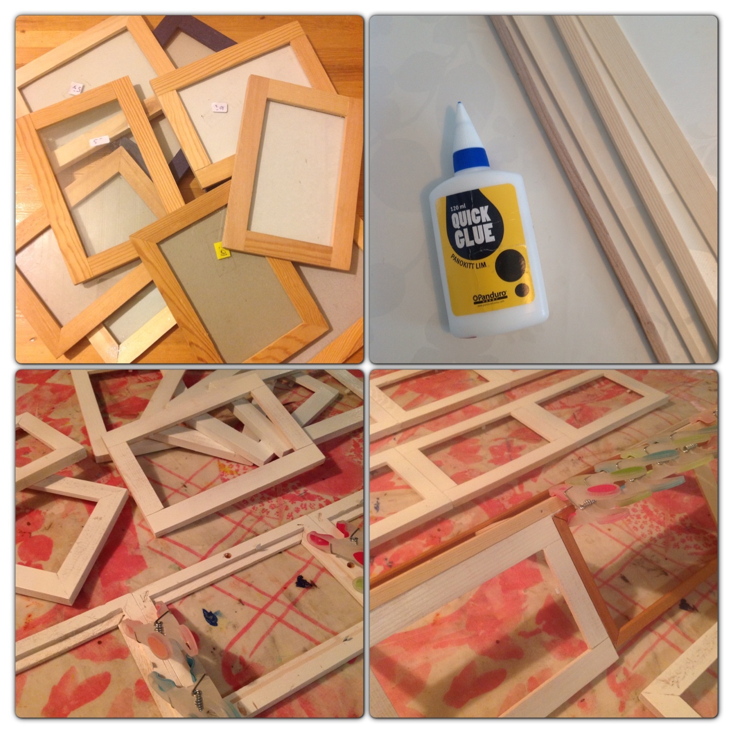 Jag började med att ta ur glasen ur ramarna och tvätta dessa. De ramar som hade färg eller var lite ojämna i kanterna fick en omgång med sandpapper. Jag målade också alla ramar med ett lager färg innan jag började bygga ihop dem. Eftersom det bara är en liten konstruktion som inte kommer utsättas för några större påfrestningar, och träet i dessa gamla ramar är torrt och lät kan spricka, valde jag att bara använda lim för att sätta ihop dem. I brist på klamrar i lämplig storlek använde jag ett snabbtorkande lim och klädnypor. Sambon muttrade givetvis över denna ”husmorslösning”… men det fungerade.