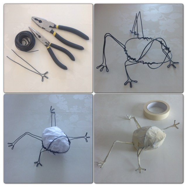 Med vårsolen väcks nya planer för trädgården till liv. Plötsligt kände jag att jag behövde en grön groda i någon av rabatterna i sommar. Jag började med ståltråd. Två längre och två kortare ben som jag surrade fast i en kropp. Jag provade lite olika benställningar. Tanken är att det ska se ut som att grodan hoppar fram ur rabatten, så därför fick den ganska raka bakben. Eventuellt sätter jag fast den på en pinne sedan så att den kommer upp lite högre bland grönskan. Jag fyllde kroppen med lite ihopknycklat papper innan jag virade frystejp runt hela konstruktionen.