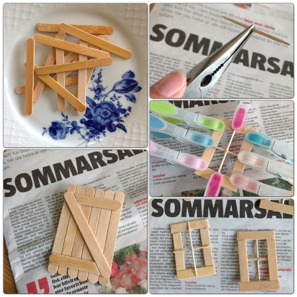 Förutom glasspinnar använde jag tandpetare, lim, hobbyfärg och en liten bit ståltråd. Dörren var enkel att limma ihop, fönstren något mer pilliga. Men med nog mycket lim och några klädnypor går det mesta. Om man klämmer glasspinnen i en tång går det att få en relativt rak brytyta. Tandpetarna klämde jag också ihop lite på mitten (där de skulle korsa varandra) med en tång.