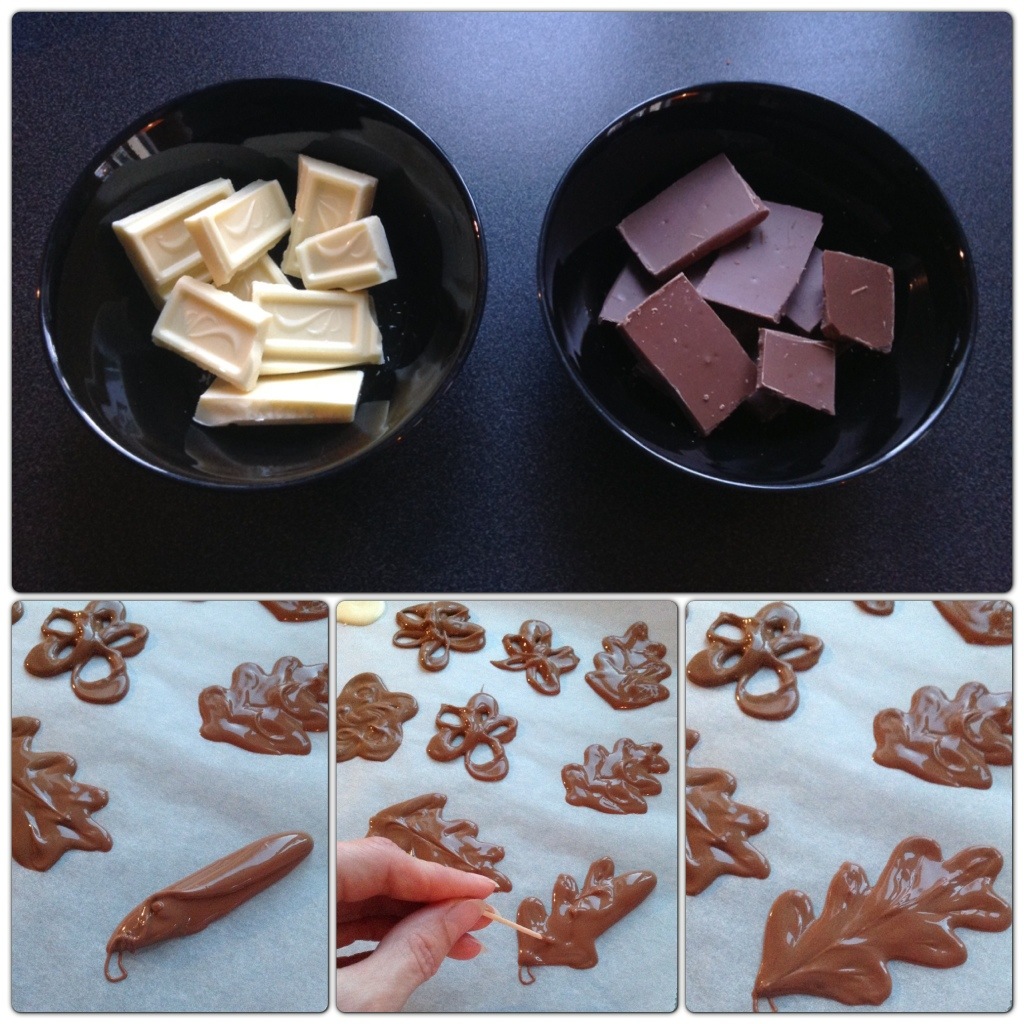 Nu kommer vi till det riktigt roliga (och pyssliga) – chokladdekoren. Men det här är också väldigt enkelt. Proffsen använder spritsar, eller åtminstone en rullad kon av smörpapper, men jag tycker det blir så mycket svinn av chokladen av det. Jag smälter chokladen i micron och använder helt enkelt en matsked som chokladen får rinna från för att ringla ut den på ett smörpapper. En klump av smältchoklad kan också formas (smetas ut) på smörpappret med till exempel en liten sked eller tandpetare (se bilder nedan). Sen ska de in i kylen eller frysen för att stelna.