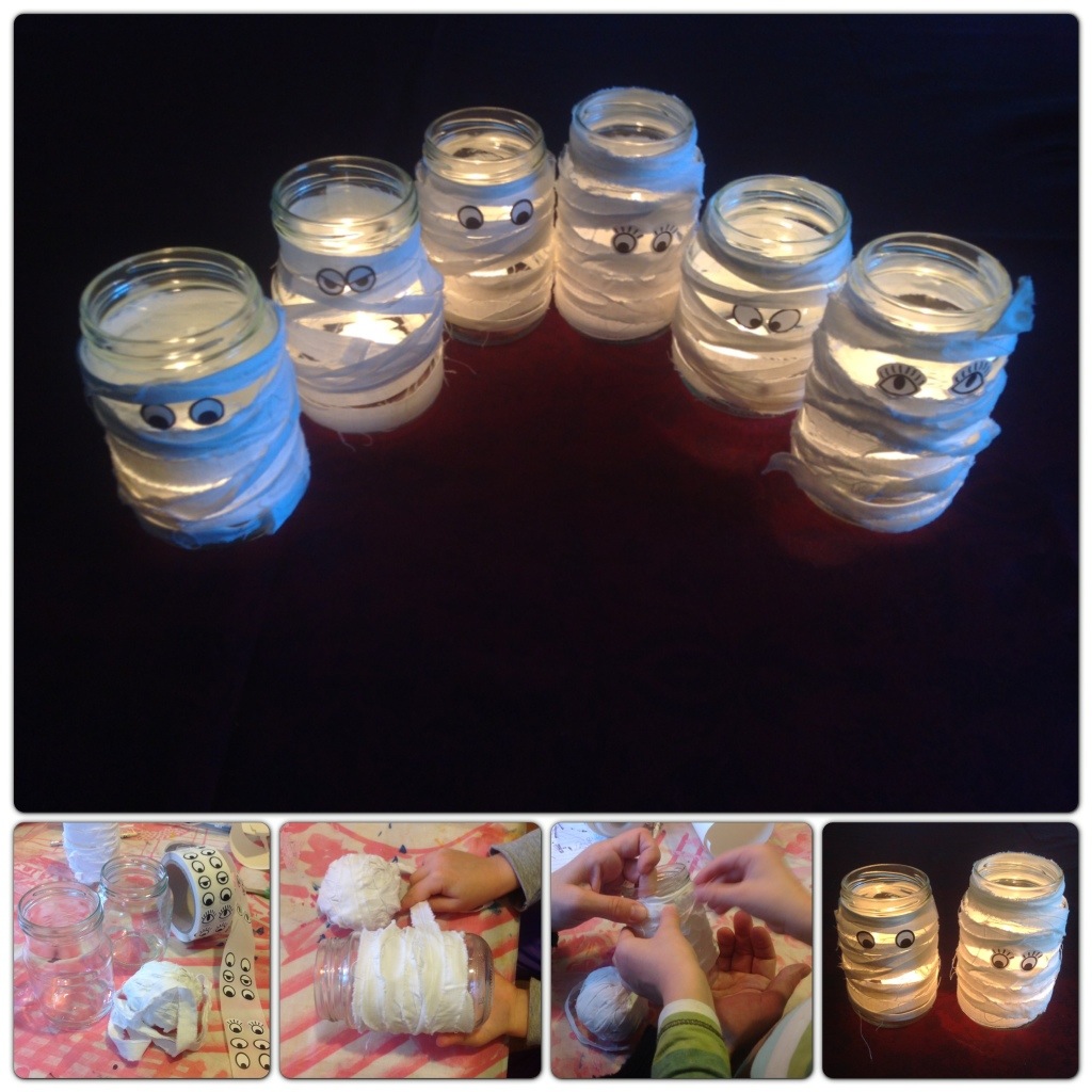 Vi klädde glasburkar med vita tygremsor och klistrade på ögon. Det går säkert bra med remsor av papper också. Med ett värmeljus i blir de stämningsfulla mumier.
