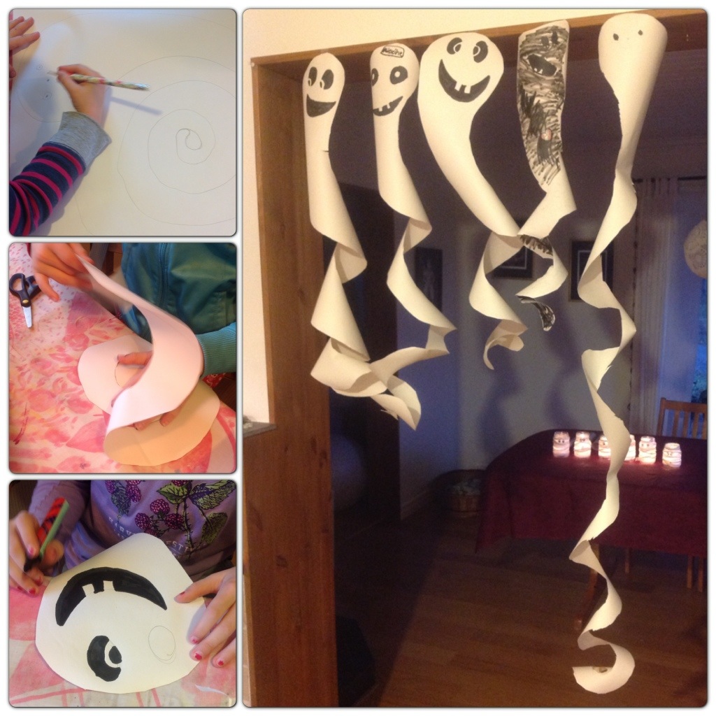 Vi ritade spiraler med ett spökhuvud på vitt papper, klippte ut och ritade ögon och mun. Inget spöke blir det andra likt när barnen får göra det själva.