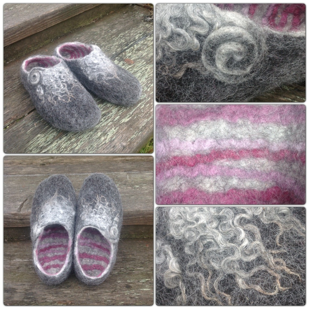 Kyla, mörker och kalla golv. Det har blivit säsong för tofflor. Jag tovade nyligen ett par kanintofflor till yngsta dottern (Tovade tofflor med ögon, öron och svans) och dessa är i princip tillverkade på samma sätt. Formar utklippta i kartong lindades in med lovikkagarn och täcktes först med grå ull och sedan svart ull. Som dekor la jag på några okardade lockar. Varmt vatten, såpa, gnuggande, rullande och knådande. När jag skulle klippa upp öppningen klippte jag ut en spiralform som jag rätade ut och tovade till en tarm som fick hänga kvar. Den rullande jag senare ihop och nåltovade fast på sidan av toffeln. När jag tagit ut kartongen, bearbetade jag insidan med en tvättmedelskula. Sista krympningen och formgivningen gjorde jag med tofflorna på fötterna. Då får man en exakt passform.