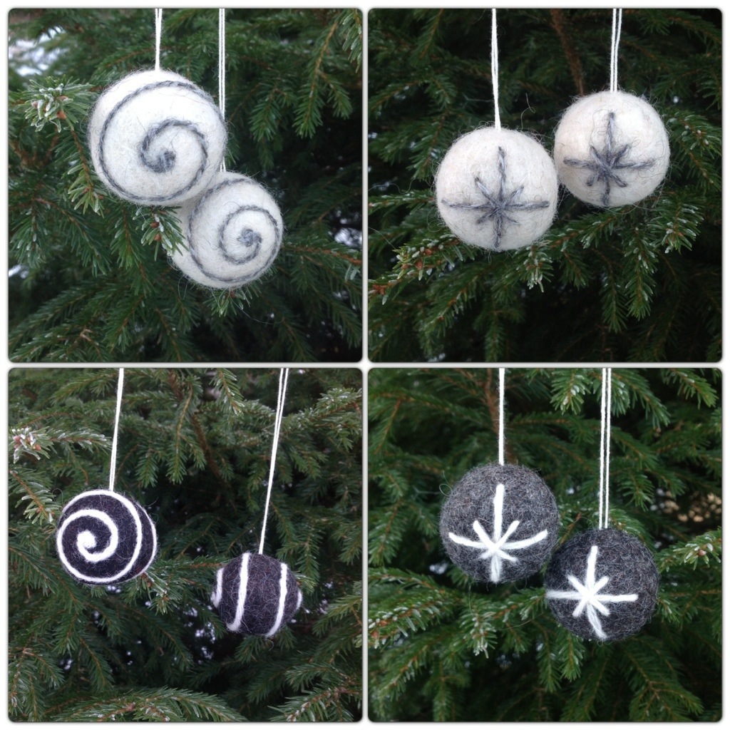Nu när julen närmar sig passar det ju ypperligt att omvandla några tovade ullbollar till julgranskulor. Med lite dekor blir de riktigt fina – och dessutom går de inte sönder om man tappar dem i golvet. I ett hem med barn, hund och kattor har jag insett fördelen med okrossbart julgranspynt…
