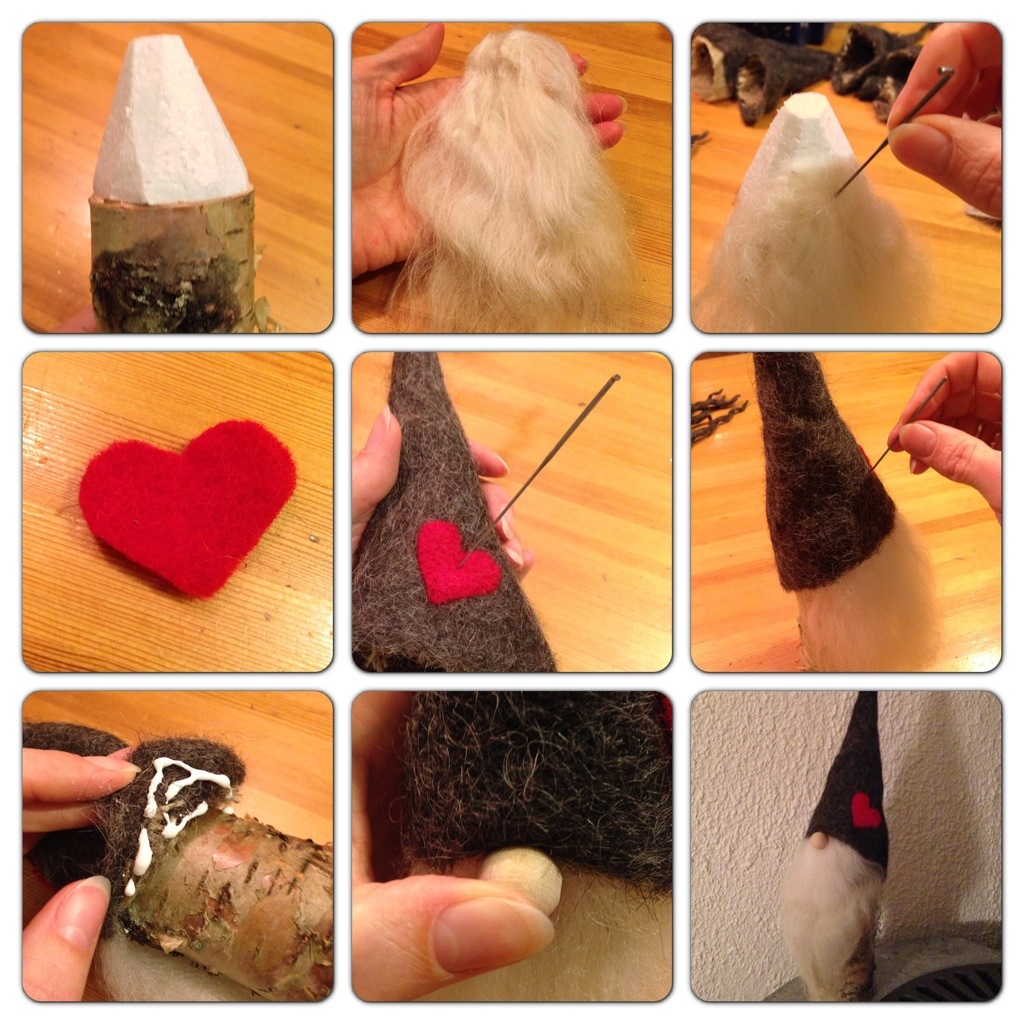 För att förenkla fastsättandet av skägget limmade jag på en bit frigolit på björkstumpen. Som skägg använde jag tvättad ull från en vit ryakorsning. Jag tog en tuss med lockar, kammade ut dem mot ändarna och nåltovade fast tussen i frigolitbiten. Luvan dekorerades med ett litet rött hjärta innan även den nåltovades fast i frigoliten. Som extra förstärkning limmade jag fast baksidan av luvan i björkstumpen. Slutligen limmade jag fast en träkula som näsa – och så var tomten klar!