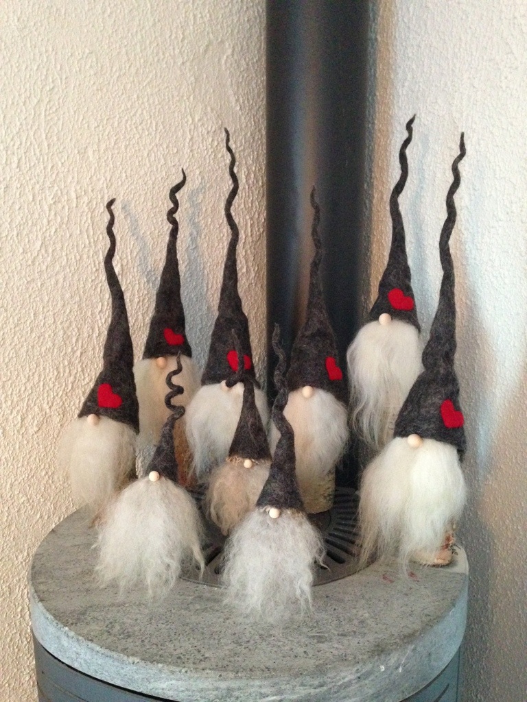 I am making them too for a coming fair ! I wasted a large batt of grey wool, I would make inner soles of it but I tied it too much so it gave bubbles and I think you don’t want to walk upon that kind of wool. So i decides to make your little gnooms.