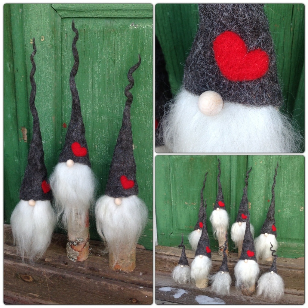 Ja, det blev en hel familj av tomtar. Det var ju en hel björk jag sågade ner, så det blev många stumpar. Eftersom det blev lite ”spillbitar” över när jag klippt ut de större trianglarna från den tovade ullen, blev det också några mindre tomtar. Som ”kroppar” till dem behövde jag mindre stumpar – så jag sågade ner en liten sälg också. Men granarna i vår skog står fortfarande kvar. Till helgen ska jag göra ett nytt försök att utse årets julgran…