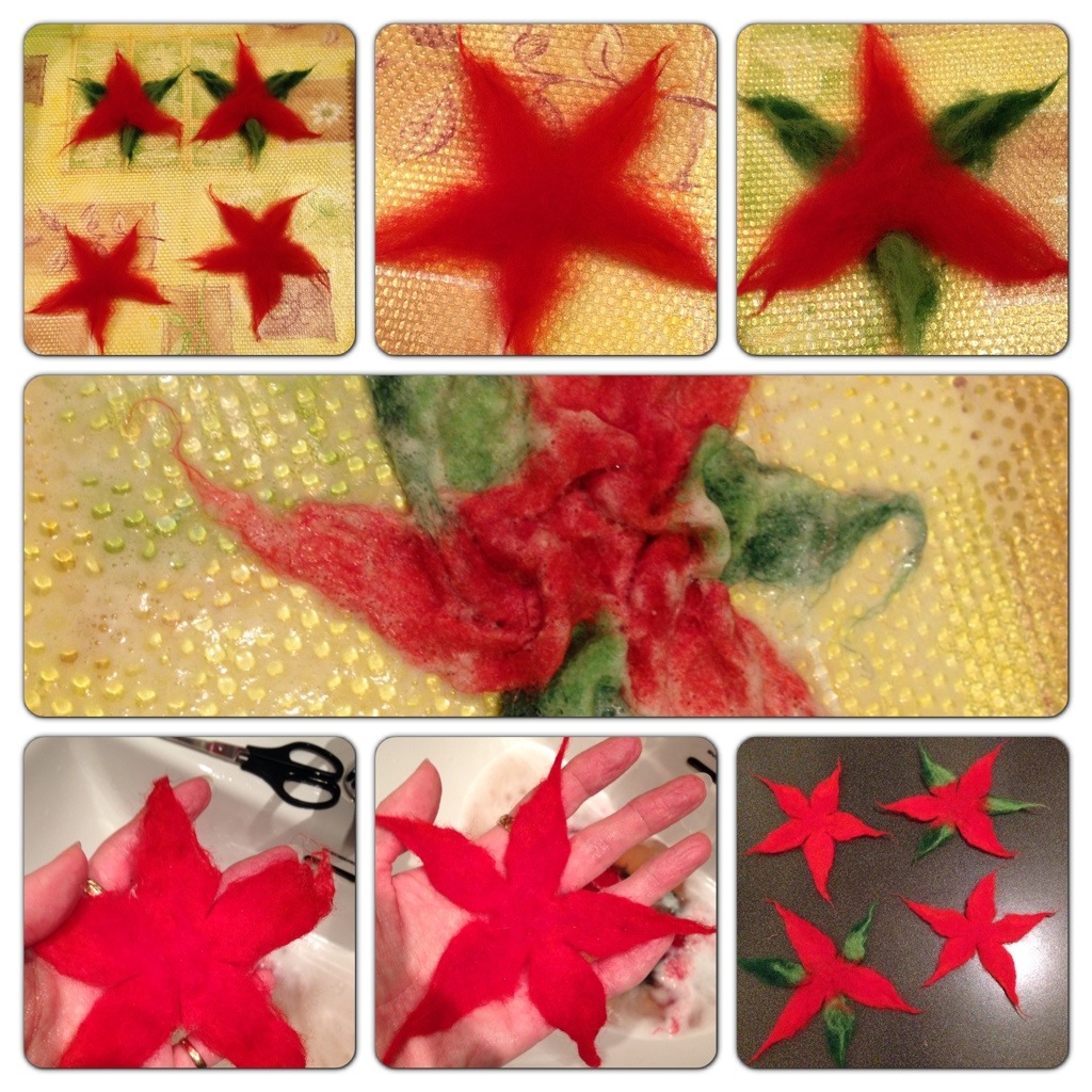 I ett tidigare inlägg tovade vi blommor till hattar. Nu har jag tovat fler blommor – men denna gång i rött och grönt för att efterlikna julstjärnor. ”Blombladen” byggs upp av några lager av små tussar av ull som man tvinnar ihop i ena änden. Jag använde två nyanser av vardera färg. När blomman håller ihop, efter lite försiktig våttovning, gör man små klipp mellan ”blombladen” och tovar lite till. Det tovar lätt ihop sig, så det gäller att veckla ut blomman med jämna mellanrum för att granska resultatet. Pillrigt – men kul!