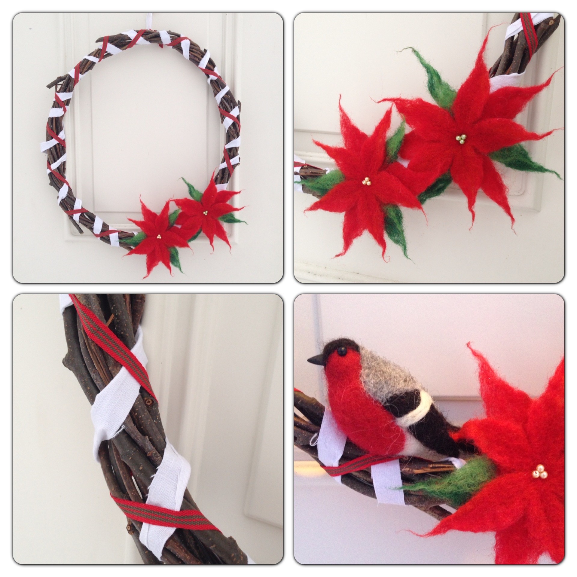Sen var det stora dilemmat vad jag skulle ha blommorna till. Man skulle kunna sy fast dem på en säkerhetsnål och använda som brosch. Eller drapera dem på en vit tovad boll, nåltova fast dem, och hänga i julgranen. Eller ha dem som dekor på en julkrans. Jag valde det sistnämnda. Jag hade en krans av kvistar som jag gjorde i höstas, men inte kommit mig för att göra något med. På den lindade jag ett varv med vita remsor av gamla lakan och ett varv med ett vävt band i rött och grönt. Sedan drog jag en sytråd genom blommorna och knöt fast dem i kransen.