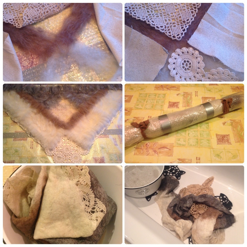 Jag började med att lägga ull i skarven mellan och under kanterna på tygbitarna och de virkade styckena. Sedan la jag ull (i vinkelrätt fiberriktning) över skarvarna och ett väldigt tunt lager ull ovanpå tygbitarna. Allt fuktades med ljummet vatten och såpa och ullen pressades ner försiktigt. Hela skapelsen låg på ett stort sjok bubbelplast som jag rullade ihop som en stor rulltårta. Nylonstrumpor fungerar utmärkt till att knyta ihop rullen. Sen är det bara att rulla, fram och tillbaka över bordet. För att inte få en ojämn bearbetning måste man då och då rulla ut och rulla om rullen från ett annat håll. Mycket rullande blir det (både i verkligheten och i texten…). När ullen börjat hålla ihop och fibrerna börja tränga igenom tygerna kan man övergå till lite mer hårdhänt bearbetning i badkaret. Växla mellan hett och kallt vatten, knåda och släng ner i badkaret. Allt för att chocka fibrerna och få dem att tova ihop sig ordentligt (s.k. valkning). När jag kände mig nöjd fick den ligga ett tag i kallt vatten med lite ättikssprit (det ska tydligen hjälpa fibrerna att sluta sig igen) innan jag kramade ur den i en handduk och la den på tork.