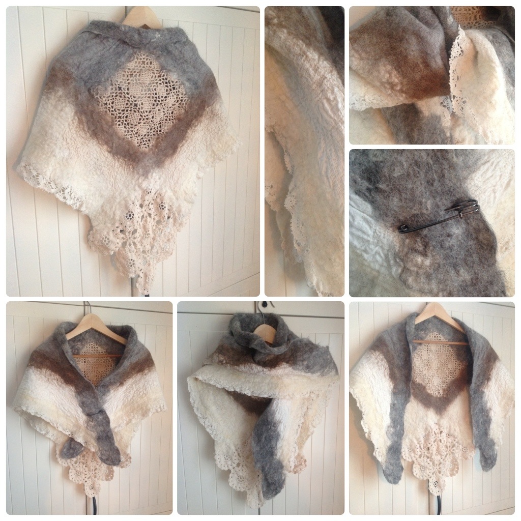 Kardad ull är ett fantastiskt material som kan tovas in i, och foga samman, olika tyger. Ur mitt ”hobbyförråd” plockade jag fram diverse tyger av olika material samt virkade spetsar och dukar. Sedan satt jag en hel kväll och provade mig fram tills det slutligen låg något lapptäcksliknande i formen av en triangel över hela köksbordet. Bitar av ett linnetyg (grått), en kökshanduk i bomull (vitt), och av en kjol i råsiden (beige). Två fyrkantiga virkade dukar och virkade spetsband i bomull. Allt detta skulle tovas ihop till en sjal med kardad ull i vitt, brunt och grått. Det vita och det gråa är lammull från våra egna får och det bruna har jag fått av en god vän (som vi köpte våra lamm av).