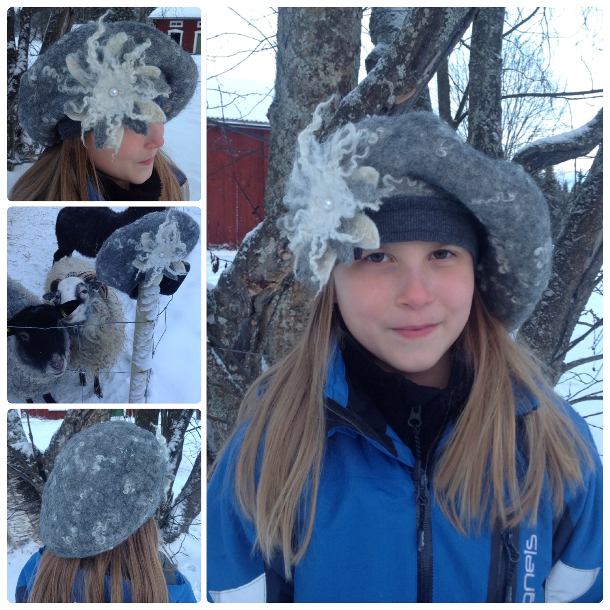 Ullblomman fick en pärla i mitten och sedan sydde jag fast den i en säkerhetsnål. Då kan bäraren av baskern själv avgöra var det ska sitta. Sedan tvingade jag ut äldsta dottern i minus 15 grader för att agera modell. En basker kan ju stukas till på många sätt, men i kylan ville jag inte fresta på 8-åringens tålamod alltför mycket.