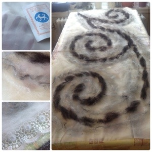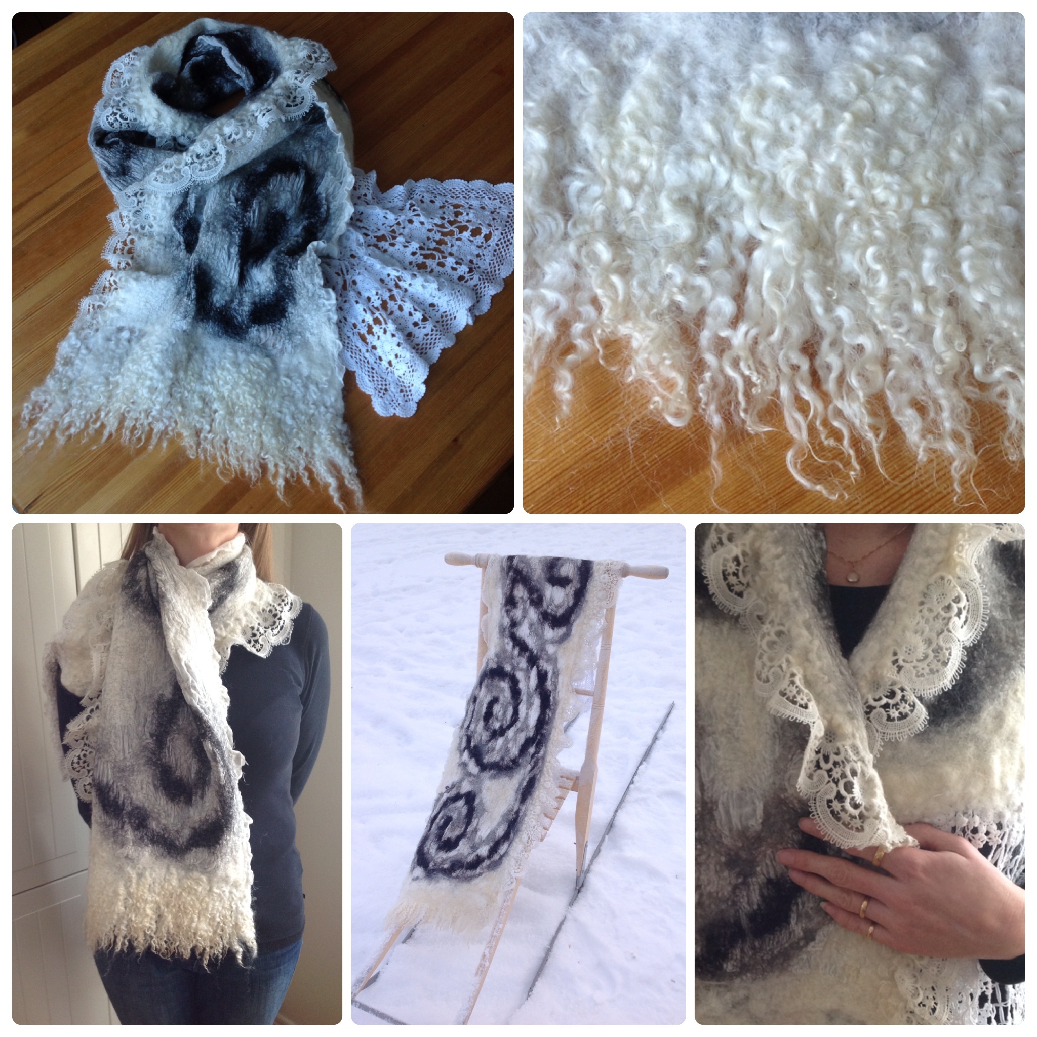 Jag klippte till en bit sidentyg i samma storlek som köksbordet. På det la jag ut ett snirklande mönster i svart ull, konturer runt det i grå ull och fyllde på med vit ull i mellanrummen. Ullen kommer från de tre tacklammen som vi skaffade i höstas – vilken tur att vi fick en av varje färg. 🙂 Den ena långsidan på tyget hade en stadkant så där lämnade jag några cm utan ull. När resten av tyget dras ihop av ullen blir det som en liten volang av sidentyg. Den andra långsidan var klippt och behövde täckas av ull för att inte fransa upp sig. Där la jag på två tunna lager ull och stack in en spets längs kanten. Jag la ingen ull längs kanterna på kortsidorna eftersom jag ville se hur mycket sjalen krympte innan jag bestämde hur ändarna skulle avslutas. På med ett nät och sedan ljummet vatten och såpa. När allt var genomfuktat började jag bearbetningen med en taggad brödkavel, sedan rullning i bubbelplast och slutligen hårdare tag med hett vatten och en skurbräda i badkaret.