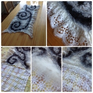 Som väntat krympte den ordentligt. Från bordets storlek (170x85cm) till ca. 100x40cm. Lite i kortaste laget för en så bred sjal, tycker jag. Så nu behövde jag förlänga den lite. I mina lådor hittade jag en virkad duk med samma bredd som sjalen (i dess nuvarande krympta tillstånd). Den tovade jag fast i ena kortsidan med lite mer ull. På den andra kortsidan tovade jag fast en rad obehandlade (otvättade) lammullslockar från vårt vita får (Brittis). Här gällde det att bara tova fast de klippta ändarna och röra resten av locken så lite som möjligt. När de sedan satt fast la jag dem i blöt med lite ulltvättmedel så att de tvättades. Slutligen fick hela sjalen ligga i kallt vatten med lite ättikssprit som sista ursköljning.