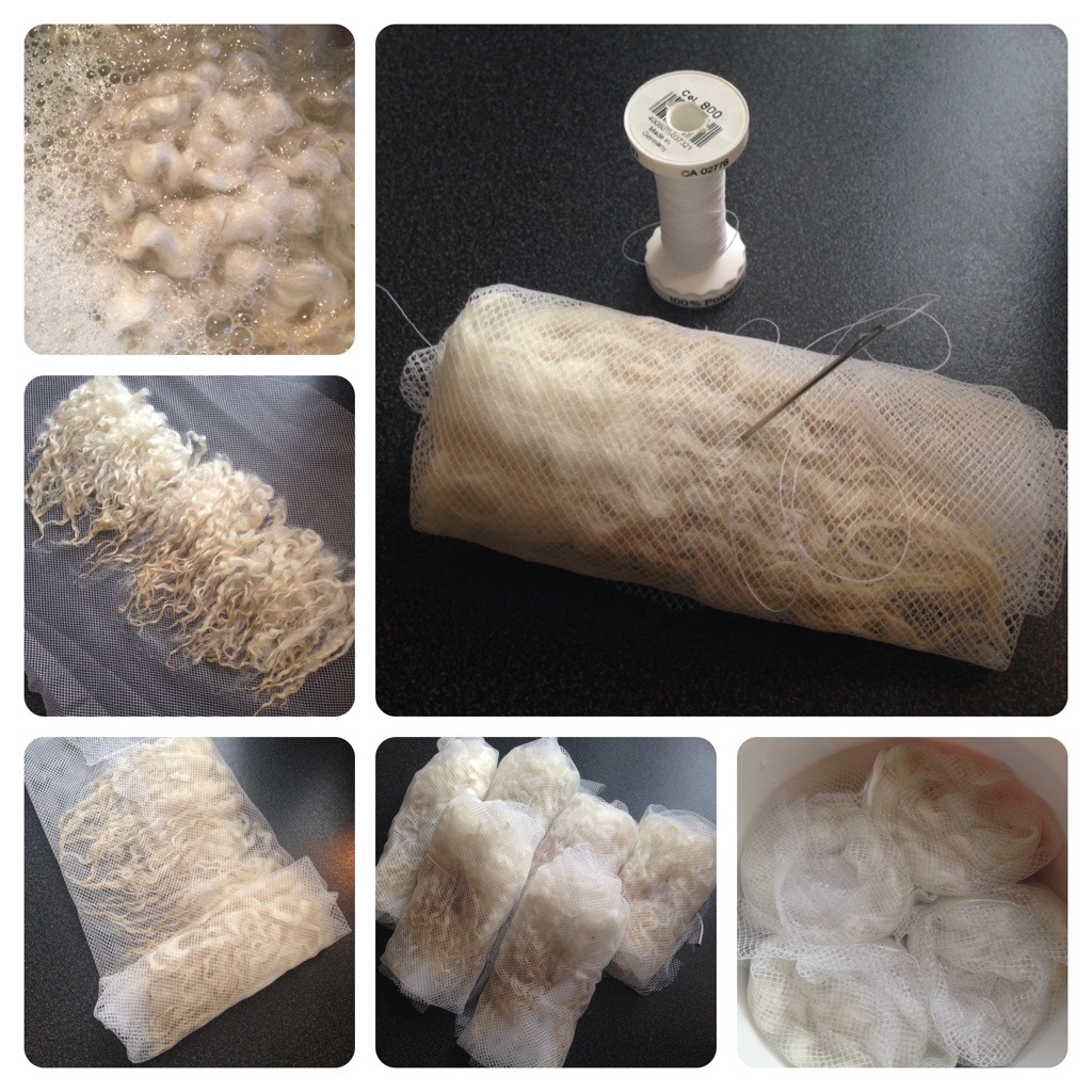 The locks were first washed in luke warm water with a little wool detergent. To keep the locks in order during dyeing i packaged them in synthetic netting. As a last rinse, the bundles were soaked in warm water with some vinegar.