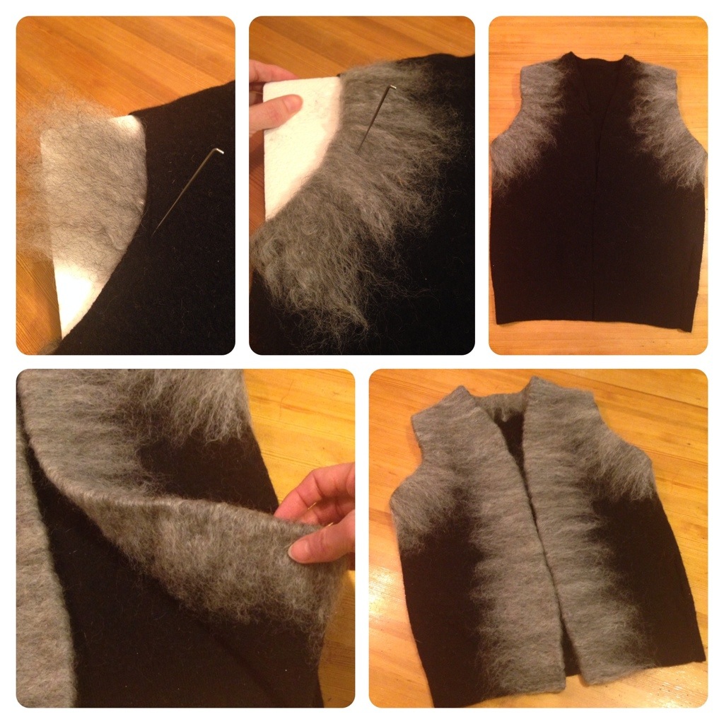 Eftersom tröjorna var tovade fransade inte de klippta kanterna. För säkerhets skull skulle man ändå kunna fålla och sy kanterna, men jag bestämde mig för att prova att tova fast ull längs kanterna istället. Jag vek helt enkelt kardad lammull över kanten och tovade fast den med en tovningsnål. Den ena tröjan var svart och fick en kant av grå ull (se bilder nedan). Den andra var mörkbrun och fick en mer diskret kant av svart ull med bruna inslag.