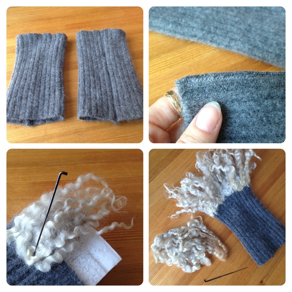 The wrist warmers with wool locks are fantastic and I do love the repurposing of materials to make new wonderful accessories. But I have a question about the felting process. Since the knitted wrist material is already felted in washing machine, how are you able to felt the locks to that material? I understand that you needle-felt them in place but still wonder how the felting happens? Thank you for sharing your lovely work!
