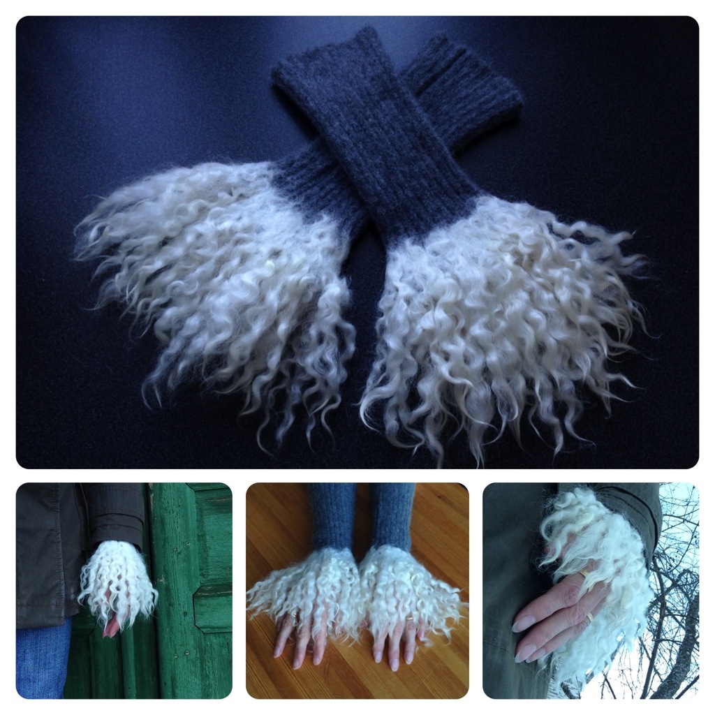 När man har tillgång till ljuvliga lockar av fårull måste man ju göra något kul med dem. Det tar emot att karda alltihop och jag letar därför ständigt efter nya idéer på vad man kan göra med råa lockar där de kan komma till sin rätt. Den här gången fick de pryda ett par handledsvärmare.