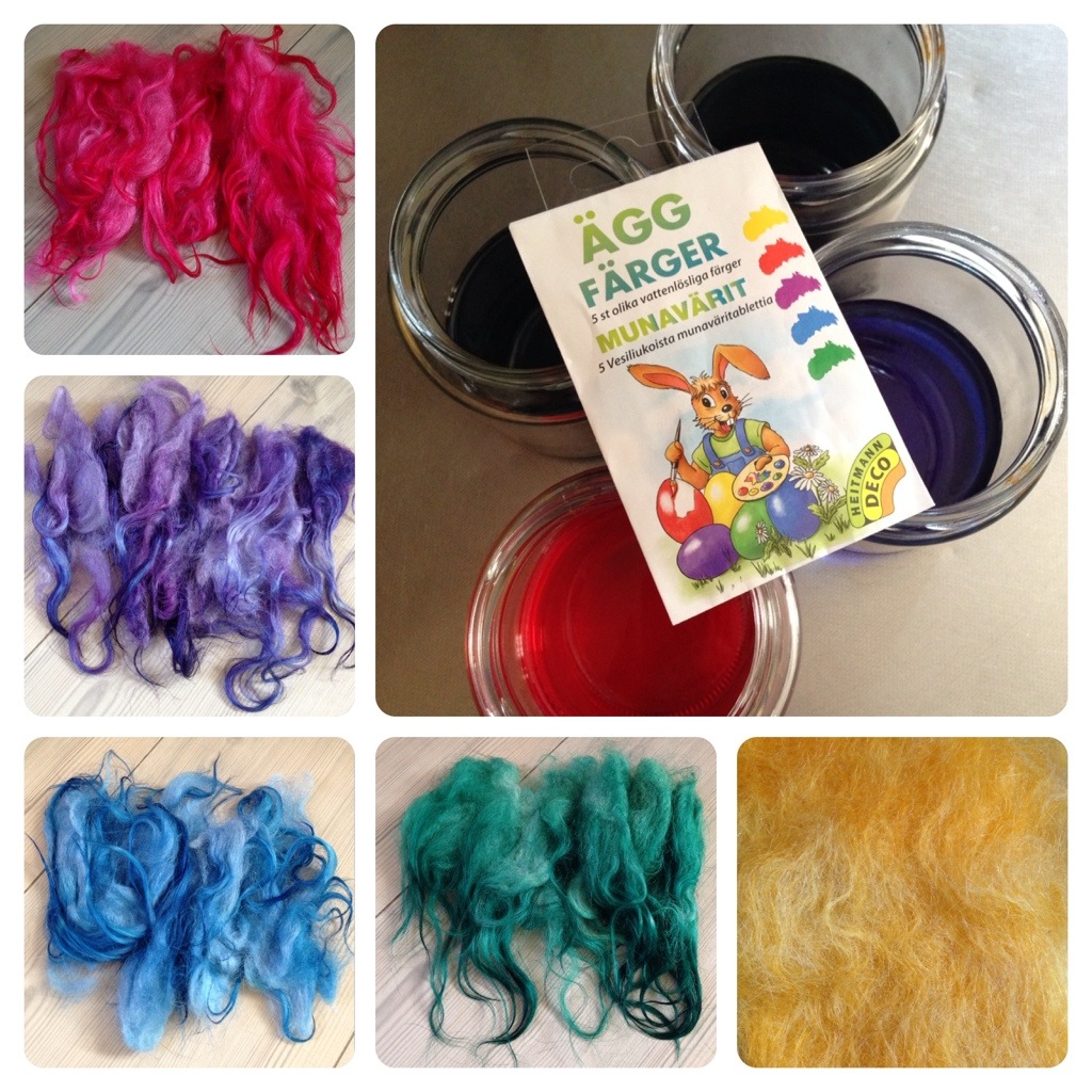 Och när äggen var färgade testade vi att färga ull i samma färgbad. Vi stoppade helt enkelt ner lite ull i burkarna och värmde dem några minuter i mikrovågsugnen. Det gick ju alldeles ypperligt. Så nu har vi just hämtat mer ull från förrådet. Vi råkar ha mer äggfärg kvar och tänkte fortsätta experimentera med detta idag.