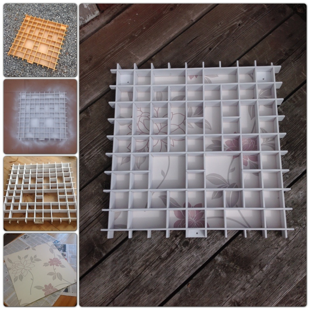 A little white spray paint makes all the difference to a couple of worn objects. After a coat of paint, the tin (a Trangia mess tin) was decorated with rub-on stickers and washi teip. The display shelf was given a backing of cardboard with wall-paper glued on.