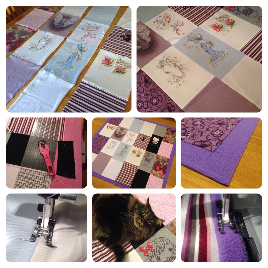 Jag sydde ihop bitarna i längder. Varje längd bestod av fram- och baksida från två tröjor. När jag sydde ihop längderna med varandra anpassade jag dem efter den mittersta sömmen och sedan klippte jag bort överskottstyg för att få raka kanter. För att göra det enkelt valde jag att sy fast det hela på ett stycke fleecetyg. Då behövs inget mellanläge (vadd). Jag sydde ihop framsidan med fleecetyget längs med alla sömmar på framsidan. Sedan rullade jag in kanten på fleecetyget över framsidan och sydde runt hela kanten. Att nåla är enklare utan hjälp av en katt, men det är ju alltid trevligt med sällskap. Och lägger man ett lapptäcke på köksgolvet så inbjuder ju det till sällskap av fyrfota familjemedlemmar.