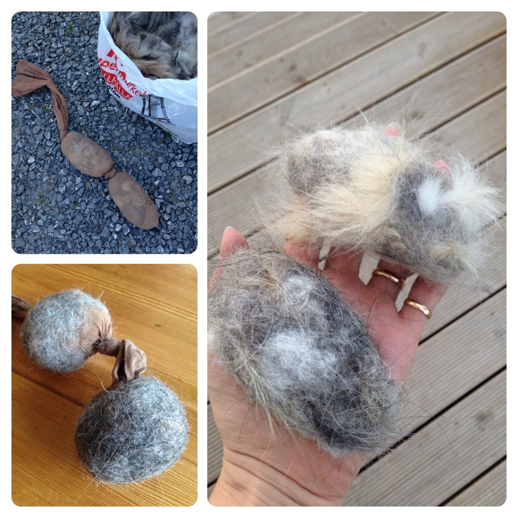 Jag tryckte ner några nävar hundpäls i en nylonstrumpa och slängde med den i en tvättmaskin. Och nog tovade det sig! En 40-graders tvätt hade nog räckt. De här bollarna åkte runt i 60-grader och det var knappt jag fick ut dem ur nylonstrumpan. De tovade sig dock ojämnt. Troligen är det underullen som tovar sig, men inte de glansiga täckhåren. Man kan säkert få ett bättre (jämnare) resultat om man kardar hundpälsen först (för att få en bättre blandning av underull och täckhår) eller om man blandar i lite fårull. Men jag hade ju i vilket fall lyckats tova några tussiga bollar av hundhår.