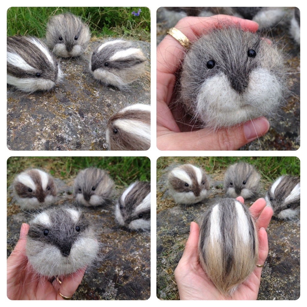 A friend has a dog (of the breed Akita) with a thick fur coat. So thick that she trims the fur at the beginning of summer. We started joking about felting lemmings from the fur and when she gave me a bag full of dog fur I just had to try. I started by felting a ball in a nylon stocking and then needle felted on tufts of dog hair. With a pair of small nails as eyes the little rodents came to life. I am fascinated by how a ball of dog hair can turn into a creature with so much personality. 😉