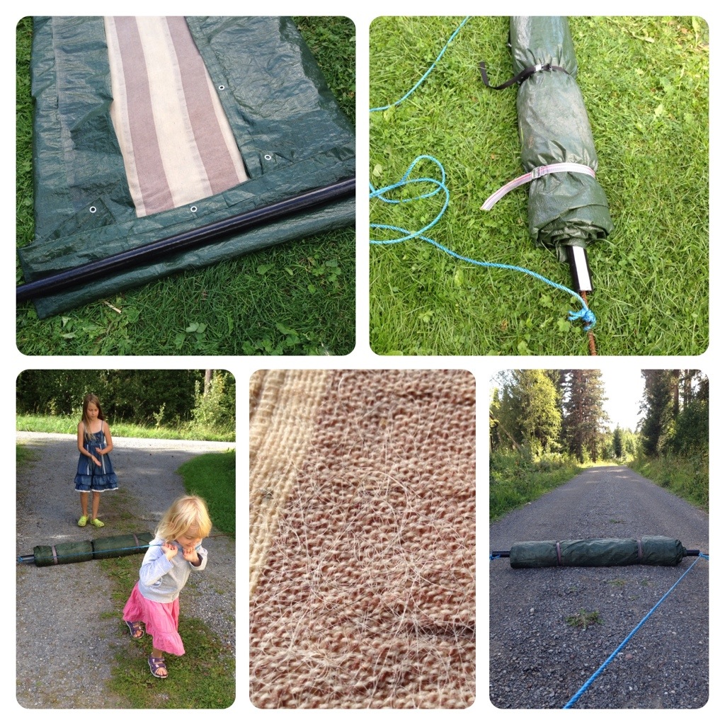 Sedan var det dags att börja rulla. Jag vek presenningen runt kanterna och rullade upp det på ett rör (av papp, förstärkt med vävtejp – det var vad jag råkade ha till hands) och drog fast det med spännband. I röret hade jag ett armeringsjärn som jag knöt fast ett rep i, på vardera sida om röret. Sedan turades vi om (barnen och jag) att gå och dra och rulla. Först upp och ned längs infarten och sedan längs grusvägen. Med jämna mellanrum rullade jag upp det hela, hällde på mer varmt tvålvatten, och rullade ihop den igen från ett annat håll. Efter ett tag syntes det tydligt att ullen börjat leta sig igenom tyget och att det drog ihop sig. Oj, vad mycket rullande det var. Men solen sken, vi hade hela eftermiddagen på oss och det fanns gott om tårta kvar till eftermiddagsfika.