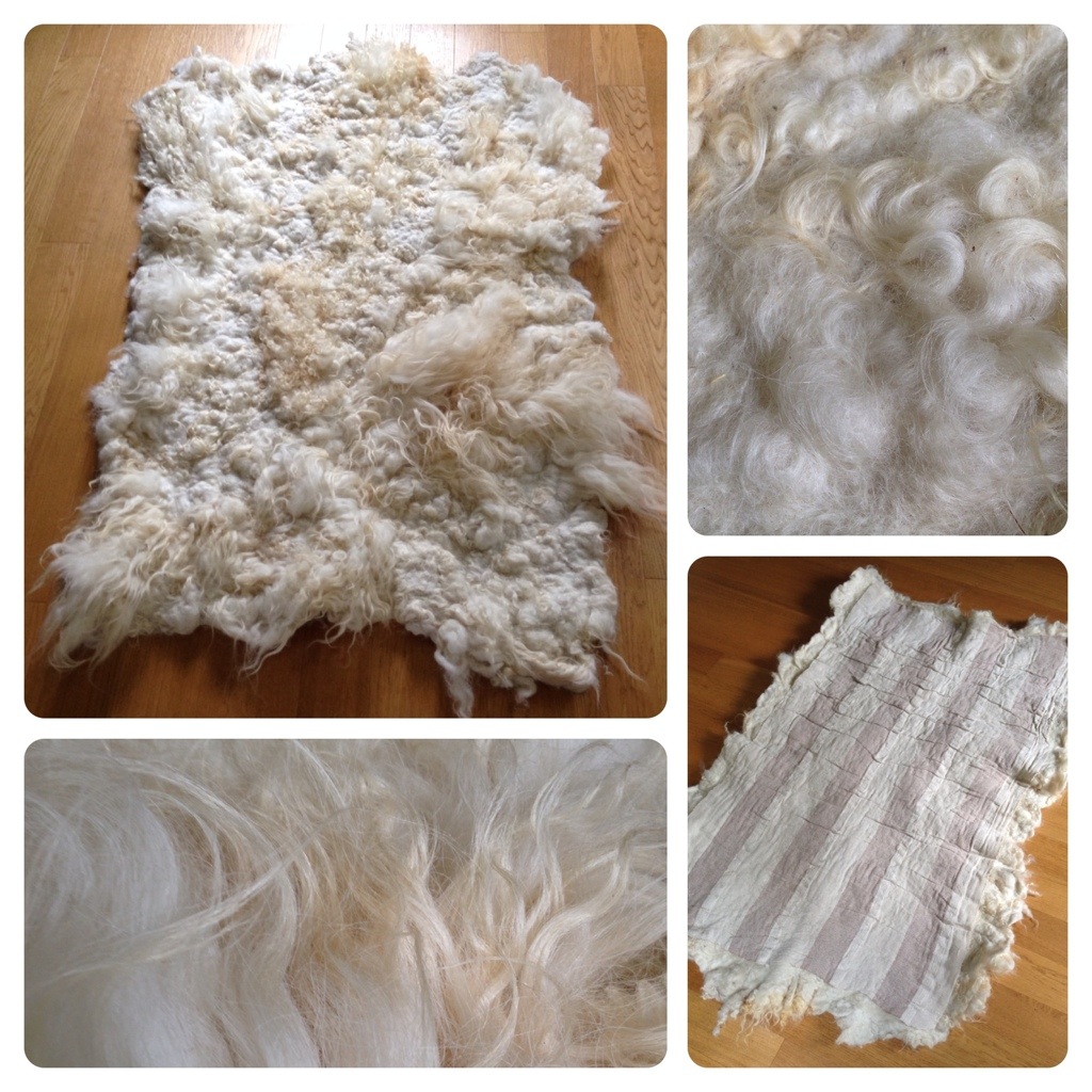 Utgångsmaterialet var vit ull från korsningsfår som jag fått av grannen vid vårklippningen. Barnen och jag la ut all ull på en presenning och plockade bort skräp och de mest smutsiga/toviga delarna. Sedan vände vi lockarna nedåt och la ihop alla sjok till en rektangel. På det la vi ut ett tunnt lager kardad ull och på det ett glesvävt bomullstyg (från ett gammalt sängöverkast). Allt blöttes ned med trädgårdsslangen.