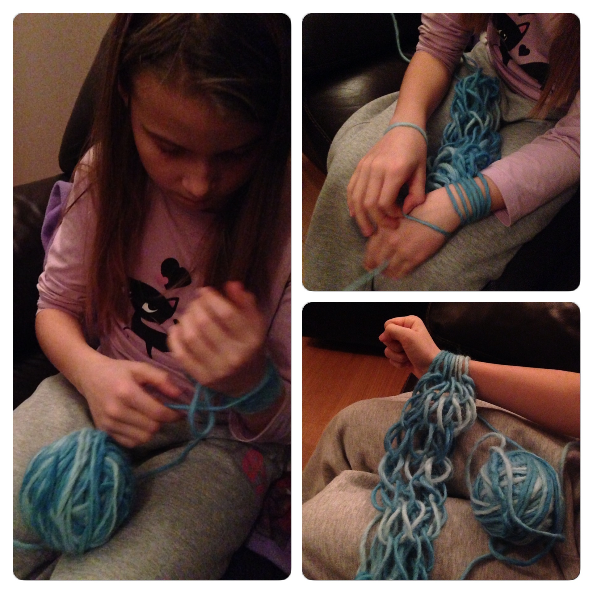 I came across a really good instruction video (via Facebook) on how to make an infinity scarf by arm knitting, and thought it might be a good introduction to knitting for my 9-year-old. She didn’t need much help getting started and could follow the instructions on her own. Then came my 5-year-old and wanted to try. She needed a little more help in the beginning, but quickly got the hang of it (with a confidence only found in 5-year-olds). She did loose a couple of stitches midway, but we found them again. This may result in infinity scarves for the whole family for Christmas, but they turned out really nicely. So I do recommend this to all parents with crafty kids. 🙂
