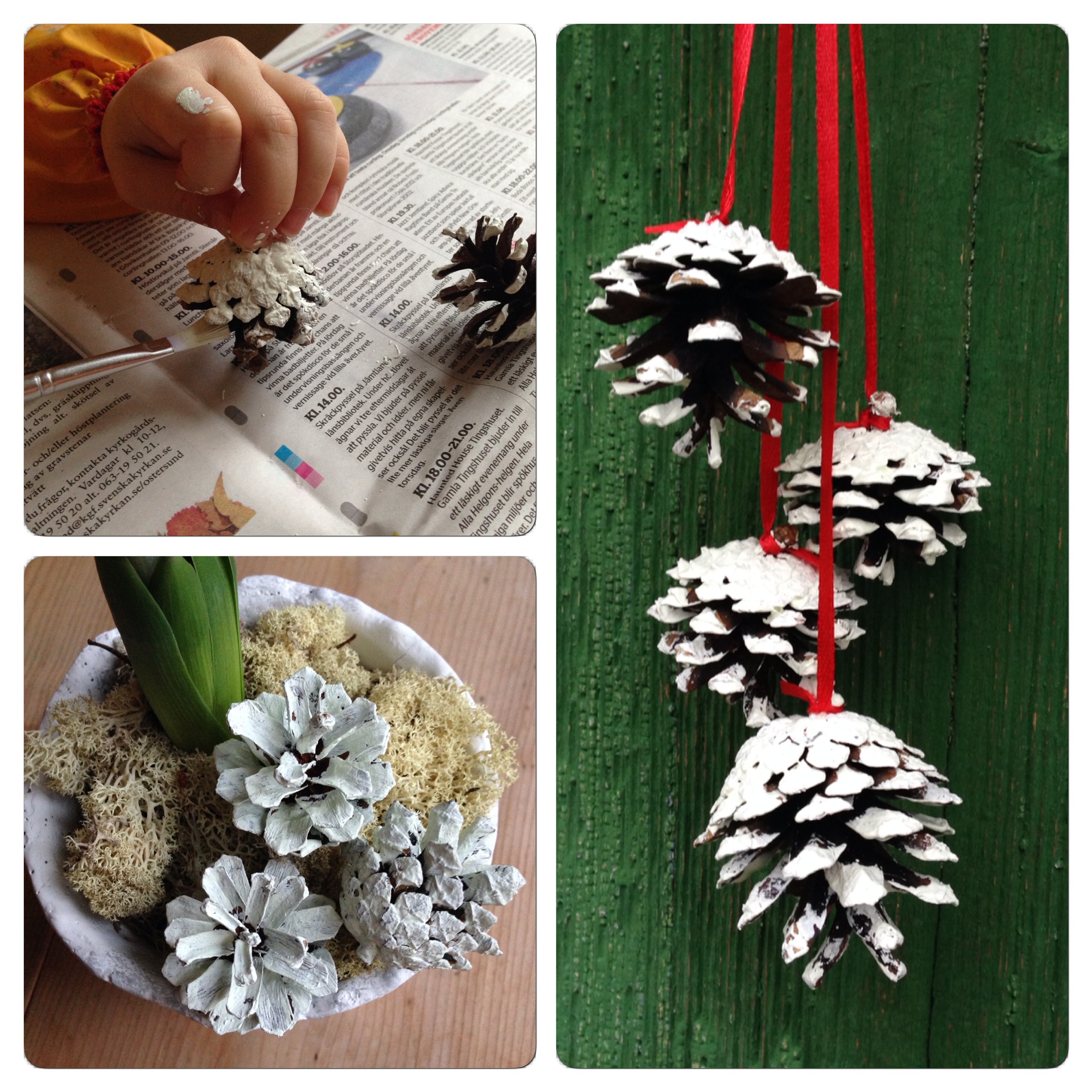 Kottar är vackra som de är, men ett enkelt pyssel är att kladda lite vit färg på dem. Man kan måla hela kotten, antingen med pensel eller genom att rent av doppa ner den i färg, eller så målar man det som är lätt att komma åt och låter det se ut som snö som fastnat på kotten.