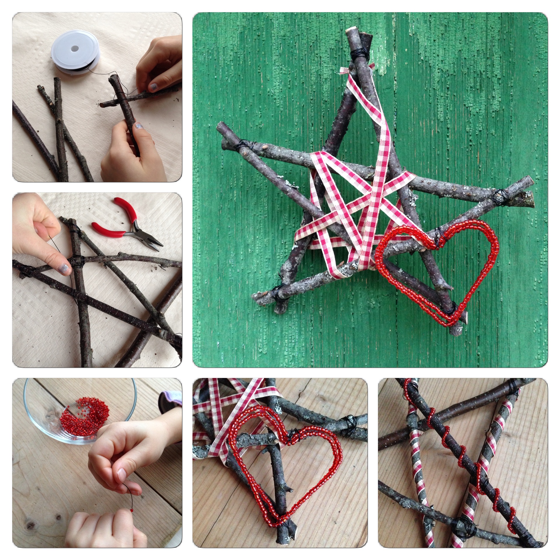 Av björkpinnar har vi gjort stjärnor genom att surra fast fem pinnar med en tunn metalltråd. Sedan har vi dekorerat dem med band och små röda glaspärlor på metalltråd. Fördelen med att trä pärlorna på metalltråd är att man då kan forma det till t.ex. hjärtan.