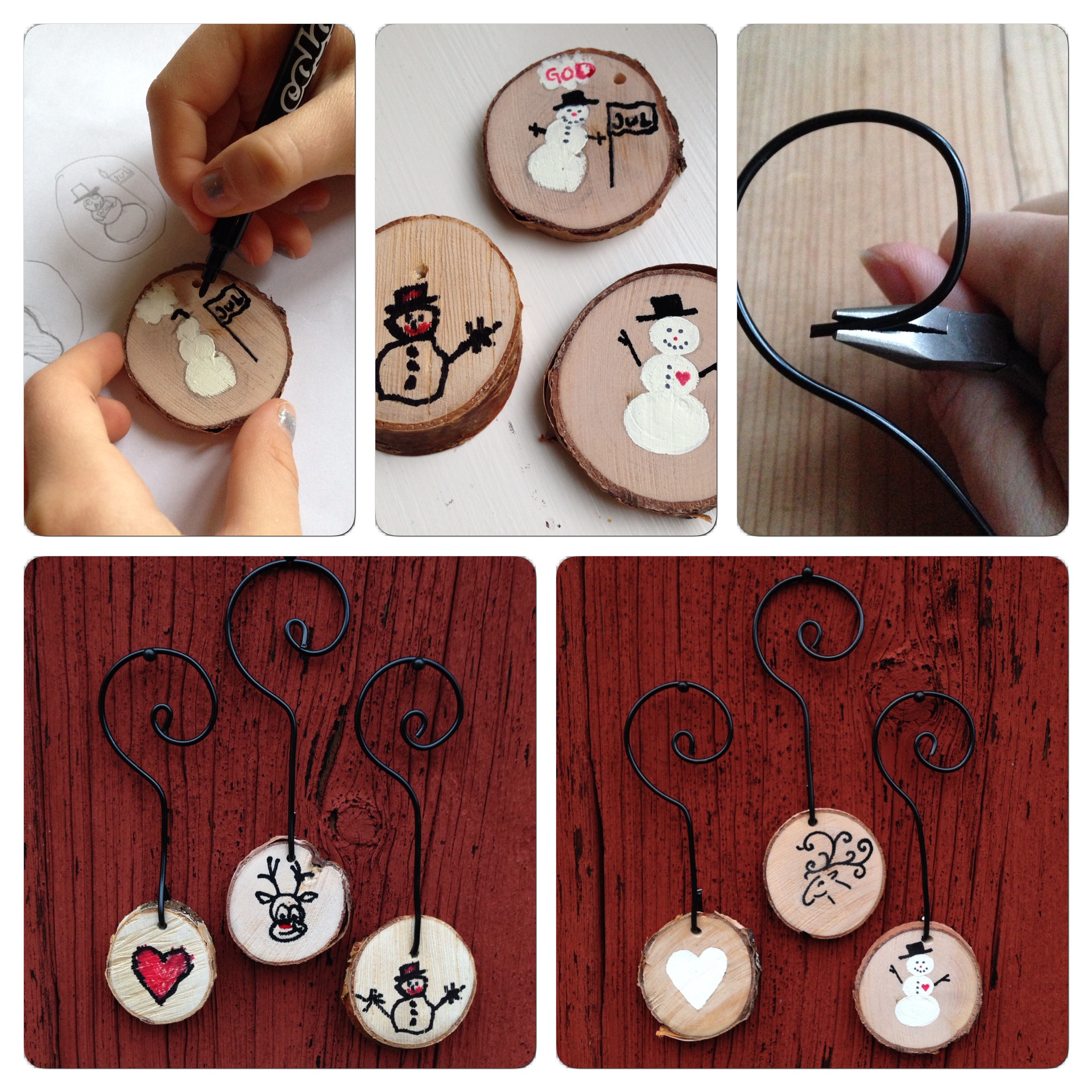 Sedan har vi också sågat slantar av mindre trädstammar och borrat hål i dem. Både barnen och jag tyckte att det var riktigt kul att rita på dem – det blev hjärtan, snögubbar, änglar, renar, och snöflingor. Och vill man inte rita något kan man ju skriva God Jul på dem, eller använda dem som namnetiketter på julklappar eller till bordplaceringen. Vi använde en tjockare metalltråd och böjde till en krok så at vi kan hänga dem i julgranen.
