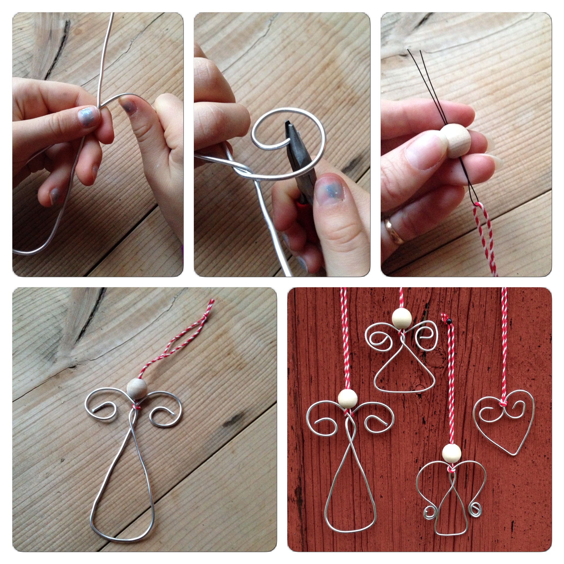 Slutligen lekte vi med en tjock silverfärgad metalltråd. Eftersom den är så mjuk och lätt att böja kunde även barnen (5 och 9 år) böja till enkla änglar och hjärtan (de har gjort allt på bilden nedan). En liten tång är bra för att böja till änden av tråden i mitten av spiralen och träkulor användes som huvuden på änglarna.