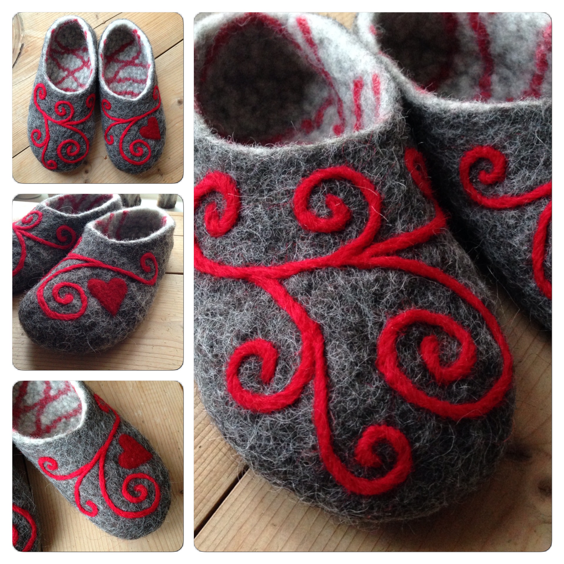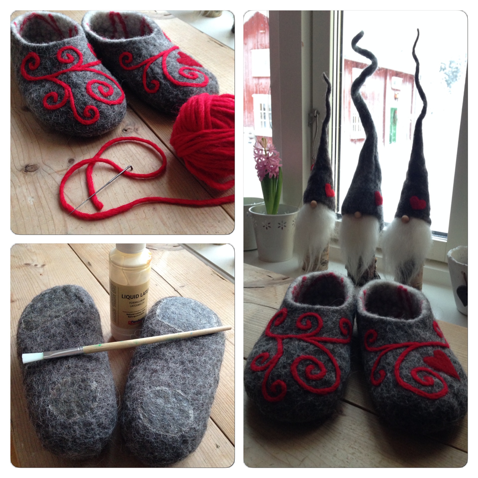 När tofflorna hade torkat igen kunde jag göra klart det sista. Jag nåltovade fast snirklar av lovvikagarn och ett rött hjärta av nålfilt. Helt plötsligt fick de gråa tofflorna en helt annan karaktär. Slutligen penslade jag på några lager naturgummilatex på undersidan för att minska halkrisken. Klart! IMG_0145
