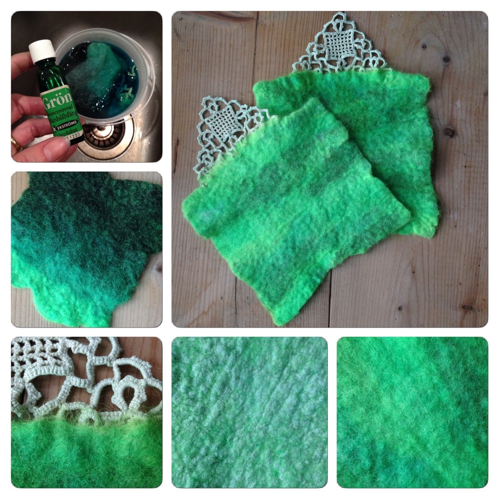 För att ge handledsvärmarna lite extra stadga tovade jag ullen på ett glesvävt bomullstyg och tovade även fast en virkad duk klippt i två delar. På det nedersta fotot i mitten ser man hur ullen har trängt igenom och tovats fast i tyget. Jag tovade också ett stycke som gick från mörkt till ljust grönt för att klippa ut dekor från.